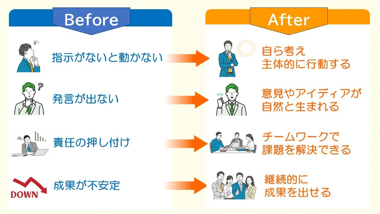 当社では、「体験型の楽しい研修」のご提供を通じて、職場の心理的安全性を高め、人と組織を成長させるお手伝いをしています.