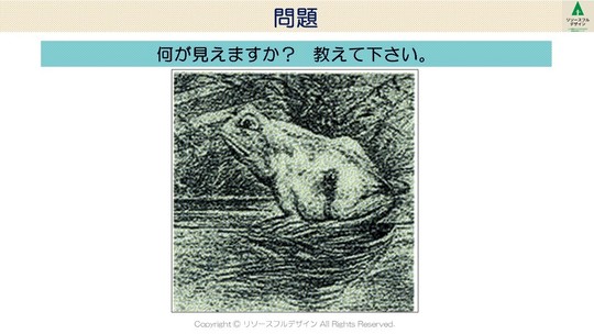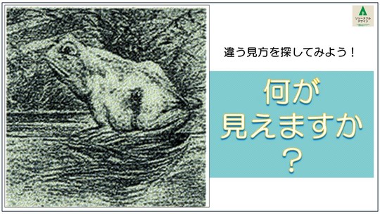 「見えている「絵」は一つですが、視点を変えると、見えてくるものが変わるということですね。普通は「カエル」という一つの見方が得られると、安心しますね。でも、ひょっとしたら、別の見方もあるかもしれないと探し続けると「ウマ」という別の見方が見つかります。ものの見方は、いろいろあるということですね。見方が変わると、見えてくるものが変わります。いま、私たちがベストだと思っている仕事上のやり方も、視点を変えると、別のもっと良いやり方が見つかるかもしれませんね。」