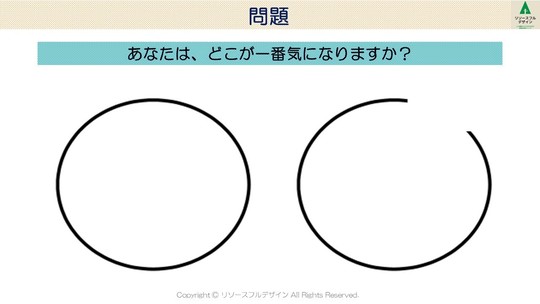 完全な輪と、欠けた輪を見比べてもらい、どちらが気になるか? 人は、欠けたところに焦点が向きやすいことに気づくワークです。