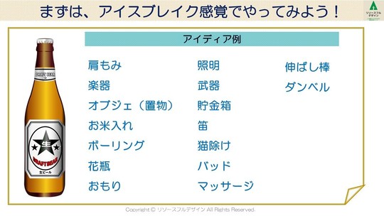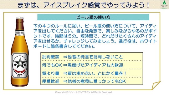 まだブレストに慣れていない状態の場合は、地ならしとして「ビール瓶の使い方」といった楽しいテーマに取り組んでから本番のテーマに入ると、参加者がスムーズに入り込めるので、おススメです。