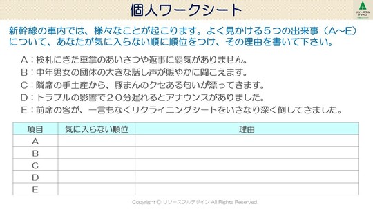 「新幹線の車内では、様々なことが起こります。よく見かける5つの出来事(A~E)に ついて、あなたが気に入らない順に順番をつけ、その理由を書いて下さい」