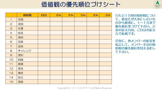 「次に、グループ内の他メンバーの結果をシートに転記し、メンバー全員の大事にしたい価値観の順位を見える化して下さい。」