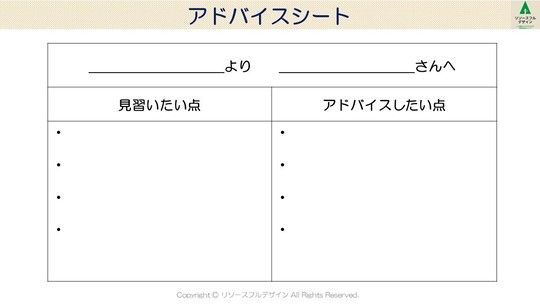 「アドバイスシートに、他メンバーの「見習いたい点(長所)」と「アドバイスしたい点(短所)」を書きます。相手のためを思って率直に言葉にしてみましょう。1人1枚ずつ、メンバー全員分書いてください。」