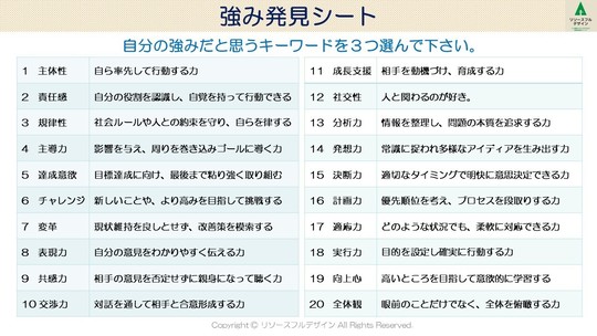 「強み発見シートを眺め、上司は部下の強みだと思うものを、部下は自分の強みだと思うものを各々3つ選んで、別々のシートに〇をつけて下さい」