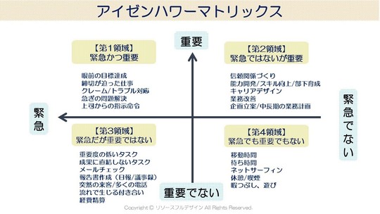 「この図は、『アイゼンハワーマトリックス』という、タイムマネジメントに関する考え方です。仕事は、重要度と緊急度の2つの軸で整理すると、ご覧のように大きく4つの種類に分類できますよね。緊急かつ重要な第1領域と、緊急じゃないけど重要な第2領域と、緊急だけど重要ではない第3領域と、どちらでもない第4領域に分けられます。」