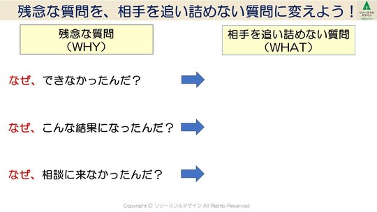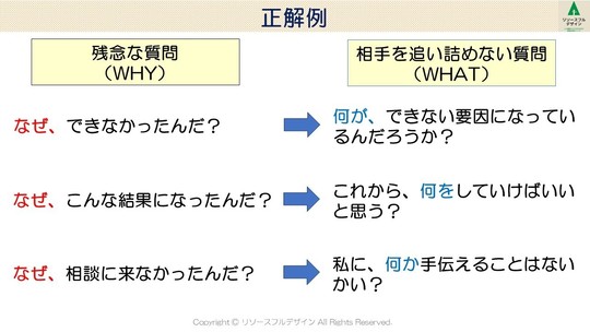 「左側の3つの質問は、相手を追い詰める詰問の代表的な例です。WHYの質問が悪いわけではないのですが、こうした言われ方をされると、部下は自分が責められたと感じて、自己肯定感が下がりますよね。思考が停止してしまいます。誰しも、こうした体験はされたことがあると思います。場合によっては、メンタルが落ちたり、パワハラにも繋がりますので、注意が必要です。では、どんな風に質問を変えれば、相手を追い詰めないで、相手の変化を引き出すことができるのでしょうか。 3人(4人)で話し合ってください。ヒントは、切口をWHYからWHATに変えてみることです。5分、時間をとります。」